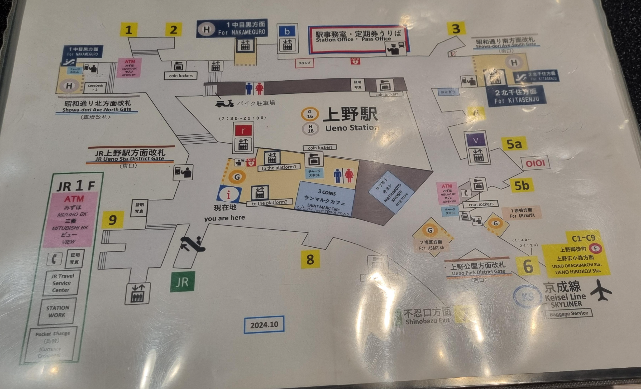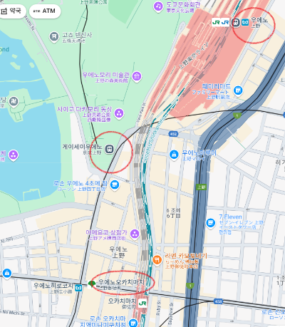 근처에 우에노오카치마치역(오에도선), 게이세이우에노(스카이라이너)역도 있어 내가 출발하고자 하는 위치로부터 이용하기 가장 편리한 노선을 따라 세 개역 아무 곳에나 내려도 상관없다. 사진으로 보면 세 역 모두 멀리 동떨어져 보이지만, 우에노오카치마치역과 게이세이우에노역 사이의 거리는 도보 3분, 우에노오카치마치역에서 우에노역까진 도보 5분이면 간다. 그러니 도쿄 초행길이라면 최대한 환승하지 않고 다이렉트로 도착할 수 있는 방법을 따라 이동하자.
