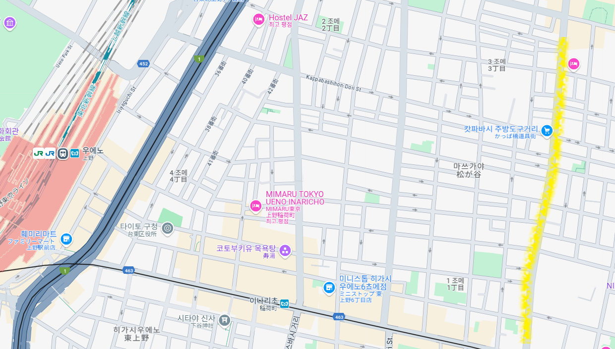 구글지도에선 우에노역까지 최소 2번 이상 환승해서 이동하는 경로를 알려주는데, 복잡하게 갈 필요가 없다.